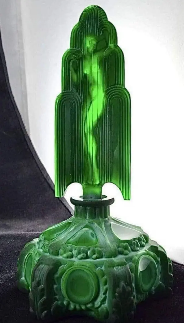 Флакон духов «Ингрид» в стиле ар-деко, изготовленный из малахитового стекла. Богемия, Чешская Республика, 1930-е годы. Изображает обнажённую фигуру под водопадом, если вы вдруг не заметили.