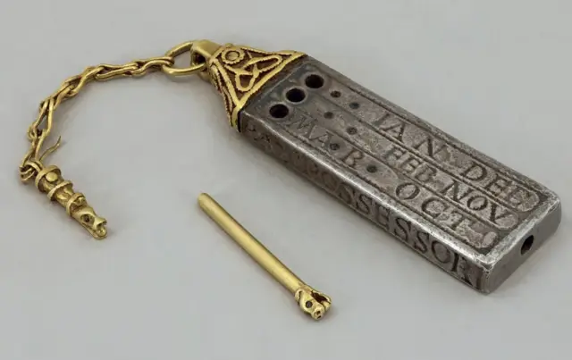 Карманные солнечные часы англосаксонского образца X века, найденные в 1938 году. Они работали с помощью гномона — маленького штырька, который вставлялся в отверстие, соответствующее нужному месяцу. Подвешенные вертикально на цепочке, часы использовали угол падения солнечного света: тень от гномона падала на шкалу, разделённую на три части дня — утро, полдень и вечер, позволяя определить время по высоте солнца над горизонтом.