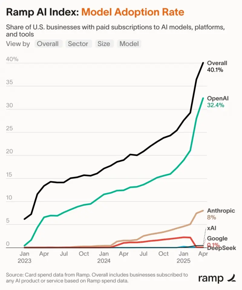 OpenAI стремительно захватывает рынок корпоративного ИИ, опережая конкурентов, согласно данным финтех-компании Ramp. По состоянию на апрель 2025 года 32,4% американских компаний использовали подписки на ИИ-модели и инструменты OpenAI, по сравнению с 18,9% в январе.