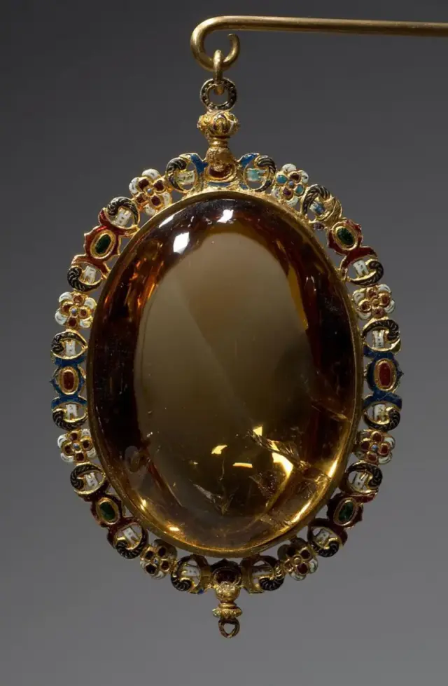 Изделие из золота и эмали, украшенное овальным цитрином (желтая разновидность кварца). XVI век н.э. Посмотреть его можно в Императорском казначействе в австрийской Вене