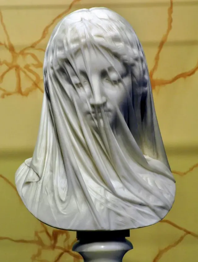 Тончайшая работа — Дева Мария под вуалью. Статуя сделана из цельного куска каррарского мрамора в Риме скульптором Джованни Страцца, 1818–1875-е