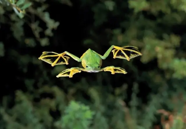 Летающие лягушки — мастера планирования: их перепончатые лапы превращаются в парашюты, позволяя совершать прыжки до 15 метров с крутыми виражами в воздухе. А липкие подушечки на пальцах гарантируют идеальную посадку на стволы деревьев.