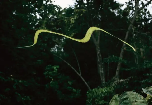Природа наделила некоторых древесных змей удивительной способностью — парить в воздухе. Змеи расплющивают тело, превращая его в подобие крыла. В таком положении они могут планировать на расстояния до 10 метров — как, например, украшенная древесная змея.