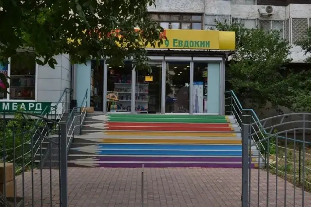 «Лестница у магазина канцтоваров. Выглядит свежо и оригинально, затраты совершенно незначительные»