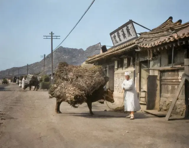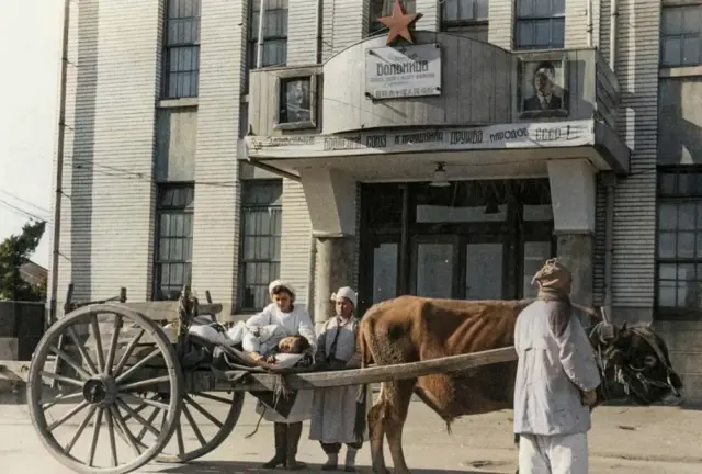 Пациент прибывает на повозке, запряженной волами, в советскую больницу в Чиннампо, Северная Корея, май 1947 года.