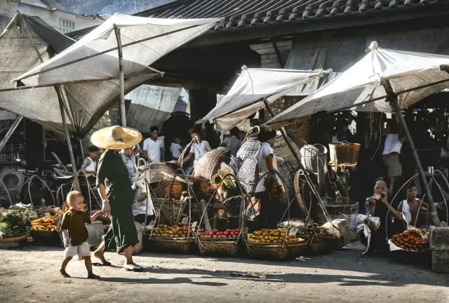 Мать с ребенком, идущие по открытому рынку в старом районе Гонконга, 1950-е.
