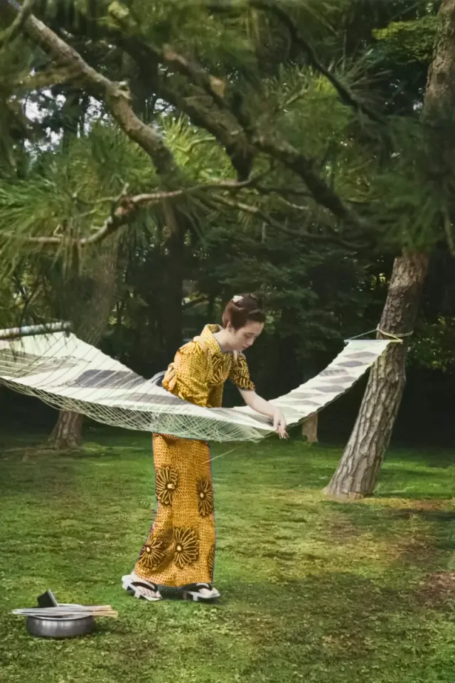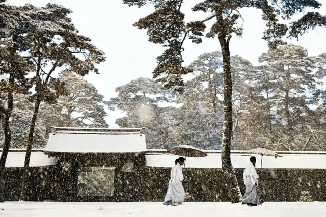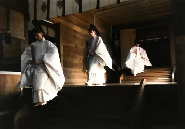 Синтоистские священники в саду храма Мэйдзи. Токио, 1951 год.