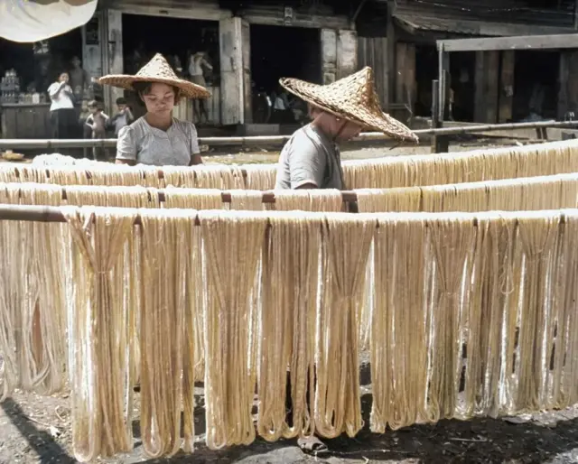 Китайские красильщики развешивают хлопчатобумажные ткани во дворах. Бангкок, 1950 год.