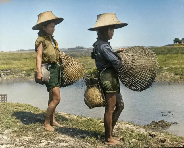 Фермерские девушки ловят рыбу в канале недалеко от Бангкока, 1950 год.