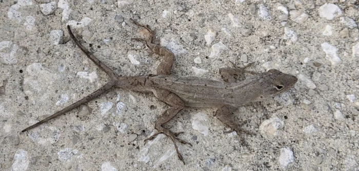 Эта ящерица имеет необычную особенность - два хвоста. Это результат нарушенной автотомии, когда вместо одного хвоста вырос второй. Оба хвоста продолжают функционировать, что делает это существо еще более уникальным.