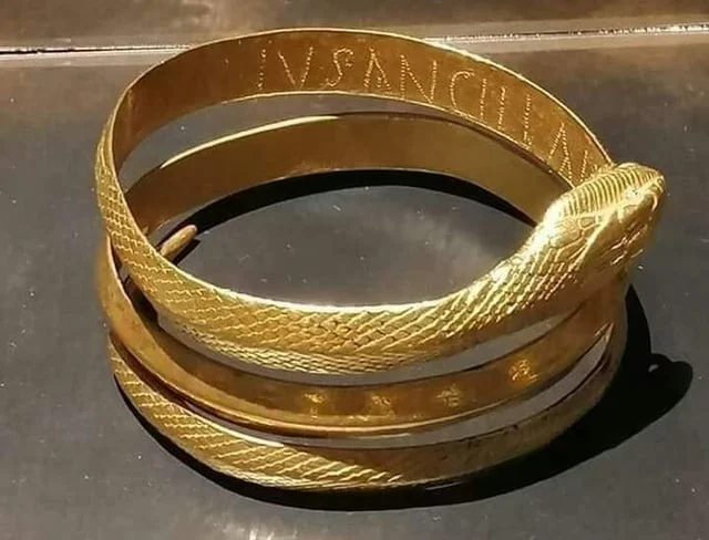 Найден на руке женщины, погибшей во время извержения Везувия в 79 году н.э. близ Помпей. С надписью на внутренней стороне "DOMINVS SVAE ANCILLAE", что означает "От хозяина к его рабыне".