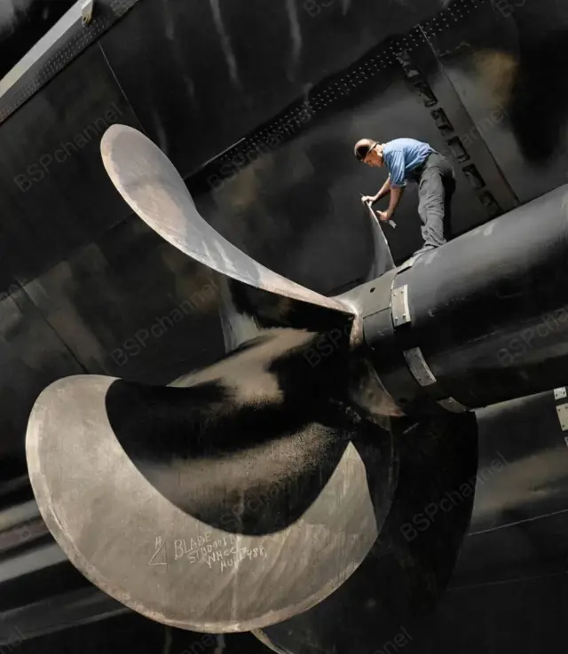 Рабочий осматривает 34-тонный гребной винт, который должен быть установлен на лайнере United Sates, Нью-Йорк, США, 1951 год.