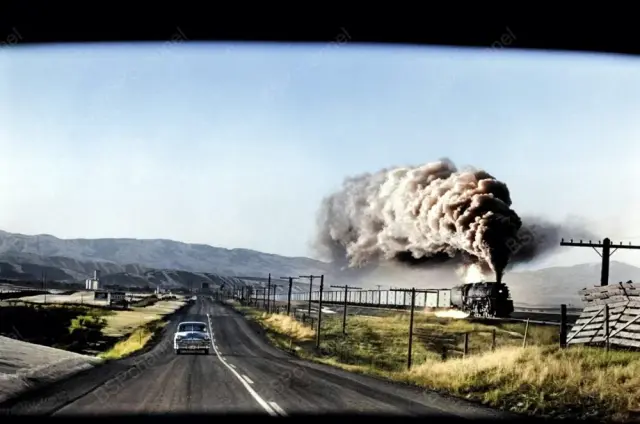 Поезд и автомобиль. Вайоминг, США, 1954 год.
