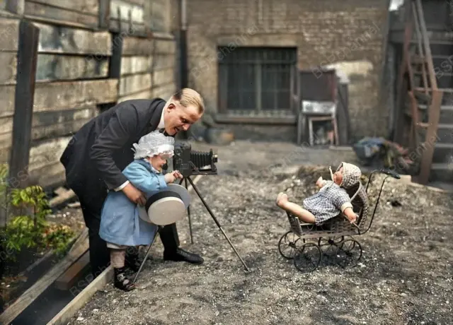Кларнетист Росс Горман и его дочь с камерой, направленной на куклу в коляске. Экстерьер, Нью-Йорк, 1920 год.