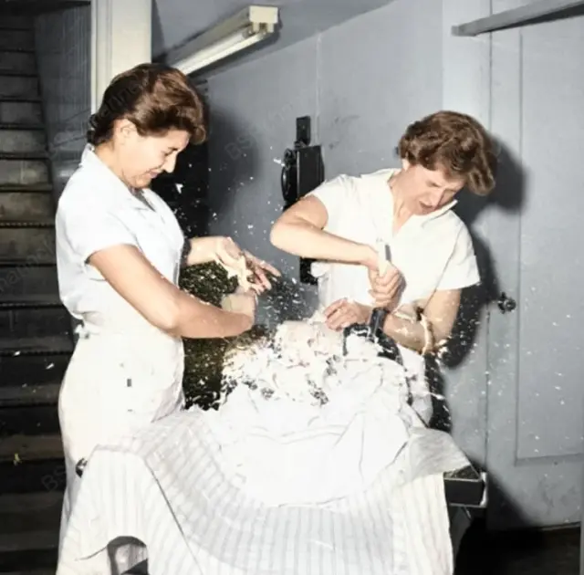 Нью-йоркская школы парикмахеров, 1959 год. К счастью обучение проводилось на воздушном шарике. Они наносят крем для бритья на шарик и должны стереть его лезвием. Одна ошибка — и шарик лопается.