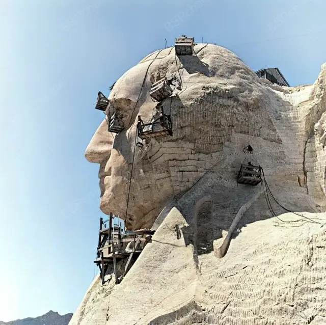 Строительство скульптуры Джорджа Вашингтона на горе Рашмор. Кистоун, Южная Дакота, США, 1940 год.