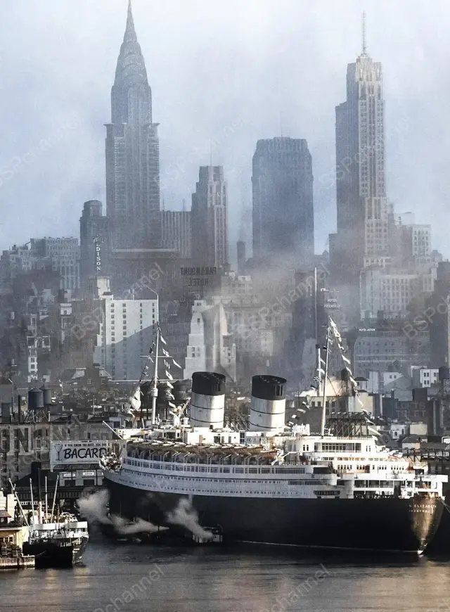 Лайнер «Королева Елизавета» в гавани Нью-Йорка, США, 1958 год.