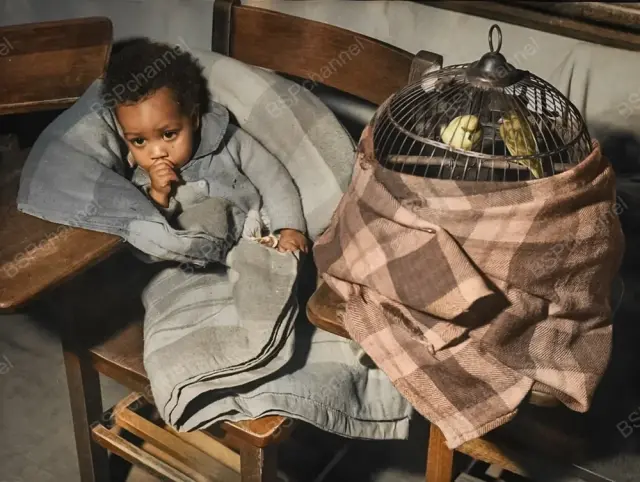 Одинокий маленький афроамериканский ребенок сосет большой палец рядом с накрытой клеткой канареек в приюте в школе во время сильного наводнения, 1937 год.
