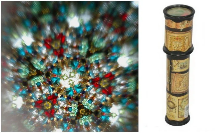 Трубка с кусочками цветного стекла внутри, через которую открывались целые миры симметричных узоров. Мы крутили его, пока голова не начинала слегка кружиться от красоты.