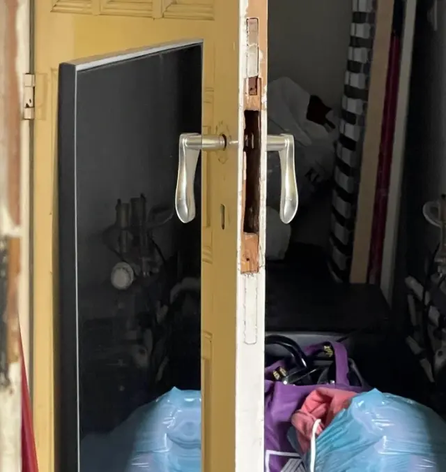Тут все просто. Кот высовывает голову в проем, а его тело находится слева наверху на шкафу за дверью.