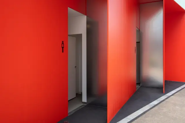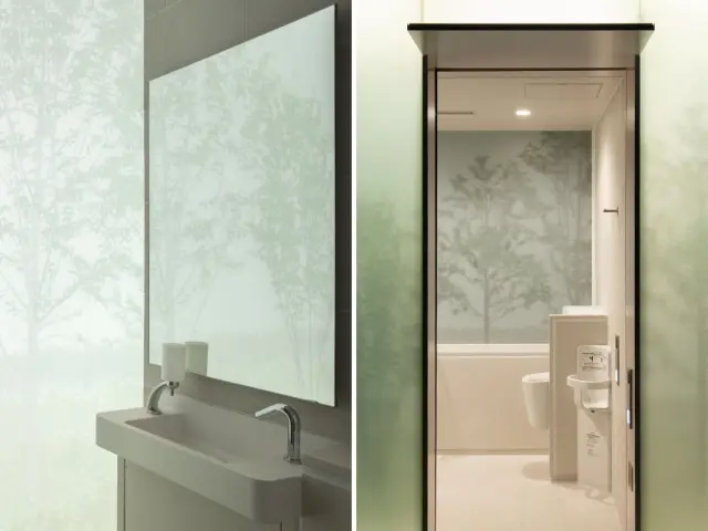 Туалет состоит из трёх отдельных помещений, оформленных по мотивам японского искусства «оригата», что создаёт ощущение завёрнутого подарка.