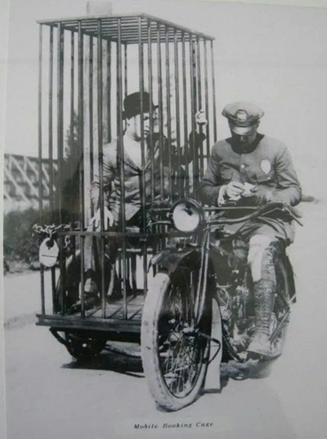 Полицейский на Харлее со старомодной мобильной камерой предварительного задержания, 1921 год.
