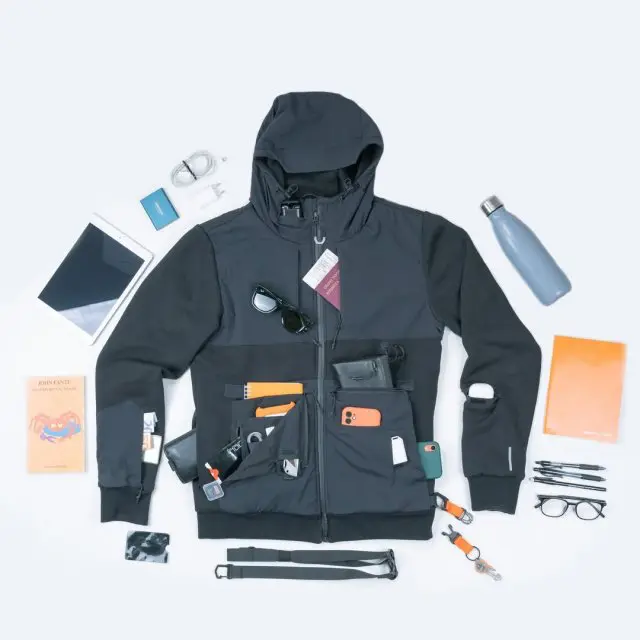 Итальянцы выпустил худи с 28 карманами — в него влезет буквально всё! Карманы тут повсюду: в рукавах, воротнике, внутри, снаружи и на спине. Все они влагостойкие, есть потайные карманы и даже с защитой от считывания карт. Предусмотрены отделения для бутылки с водой, планшета и даже пары бокалов пенного. На Kickstarter радость барахольщика продают по цене от €99