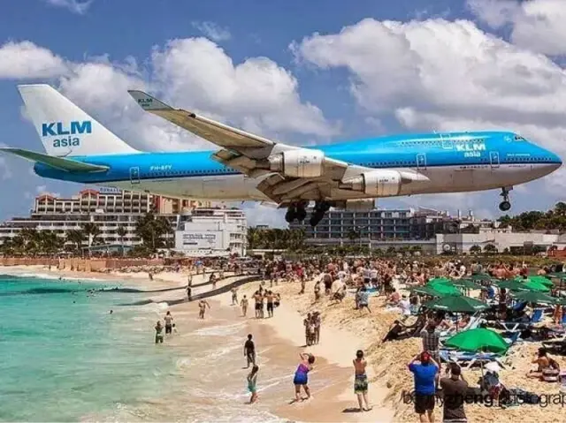 Пляж Махо на острове Сен-Мартен известен низколетящими авиалайнерами, которые пролетают так низко над пляжем, что людей может сбросить в воду из-за реактивной струи