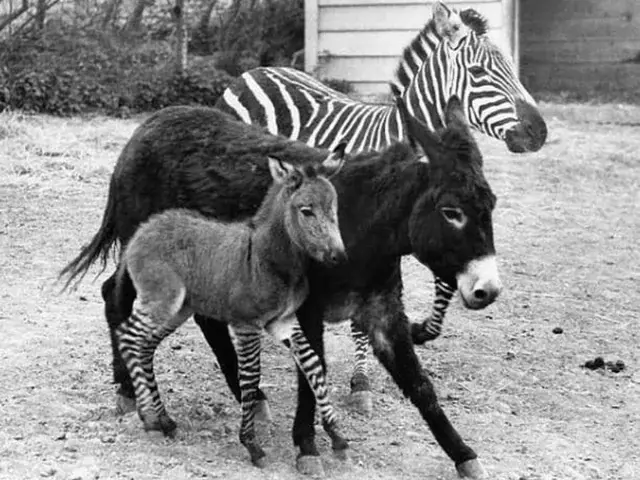 Очаровательный малыш с отцом-зеброй и матерью-ослицей в Колчестерском зоопарке в 1971 году