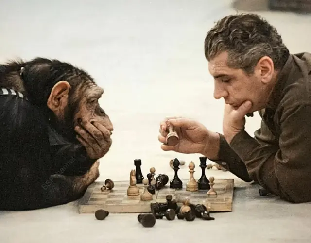 Обезьяна Рикки и ее дрессировщик Степан Исаакян играют в шахматы. Ереван, 1965 год.
