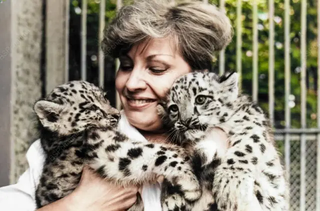 Сотрудник Московского зоопарка И.А. Кузьминых с детенышами ирбиса (снежного барса). Москва, 1985 год.
