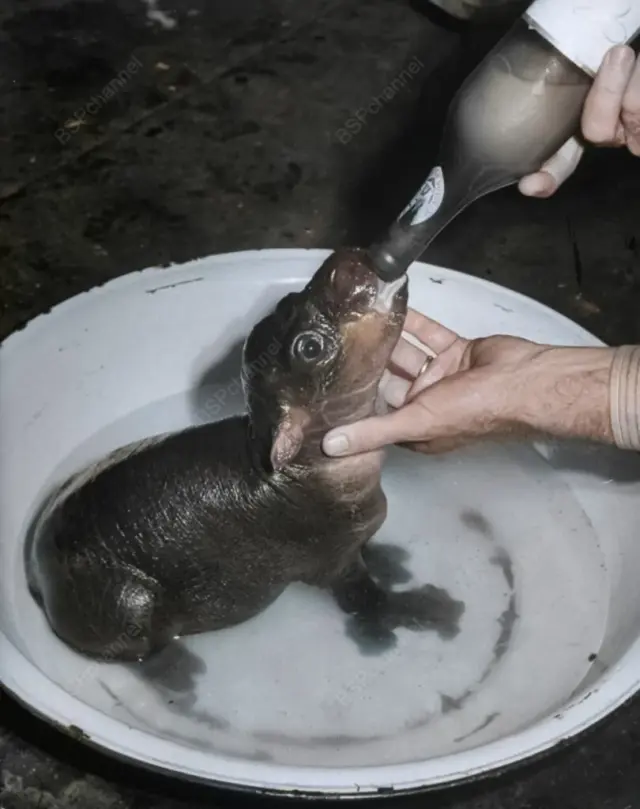 Бегемот по кличке Скиппер пьет молоко, 1941 год.