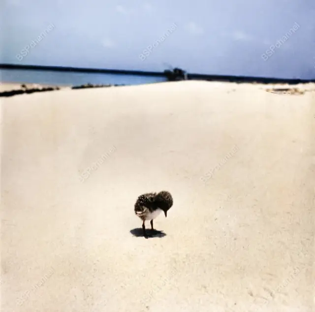 Птенец тёмной крачки одиноко стоит на пляже, ожидая возвращения родителей с ежедневной охоты в море, 1954 год.