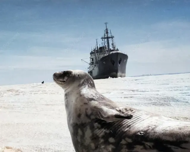 Тюлень на фоне научно-исследовательского судна в Антарктиде, 1965 год.