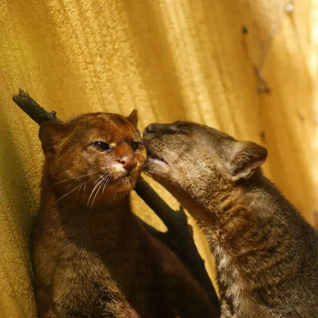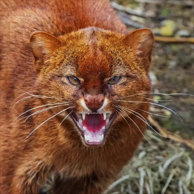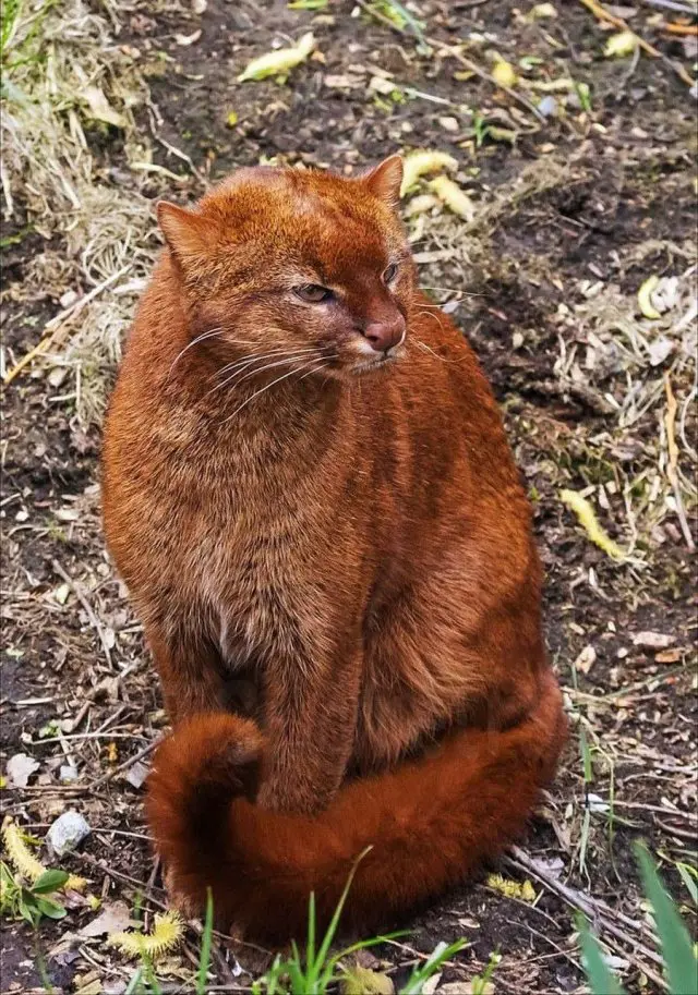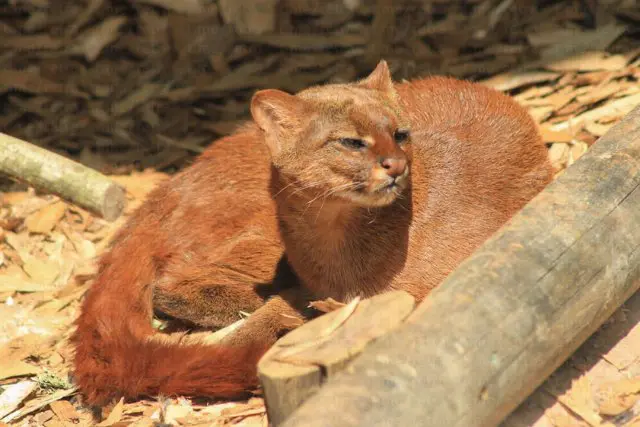 Так выглядят Ягуарунди, живущие в Центральной Америке. Это очень скрытные хищники с хорошо развитыми зрением, слухом и обонянием. Они ведут наземный образ жизни, но также хорошо лазают и плавают. У этих кошек более 13 разных типов голосов. Они могут щебетать, свистеть, мяукать, рычать и даже трещать — спектр звуков шире, чем у остальных кошачьих. Местные жители называют их «свистящими кошками». Генетически ягуарунди — «маленькая пума» размером примерно с домашнюю кошку.