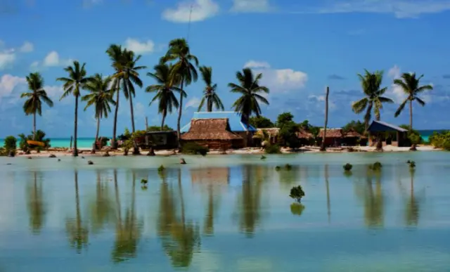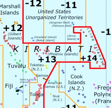 Кирибати — островное государство. В XVIII веке первооткрывателям не хватило терпения придумывать названия маленьким островам, и так они и остались. Польша, Париж, Лондон и Банан — это города на острове Рождества. Вообще, страна Кирибати состоит из 33 островов, которые раскинуты на 5000 километров посреди океана и поэтому долгое время находились сразу в четырёх полушариях. Чтобы не возникало путаницы, в 1995 году линию перемены дат изогнули так, чтобы она охватила все острова.