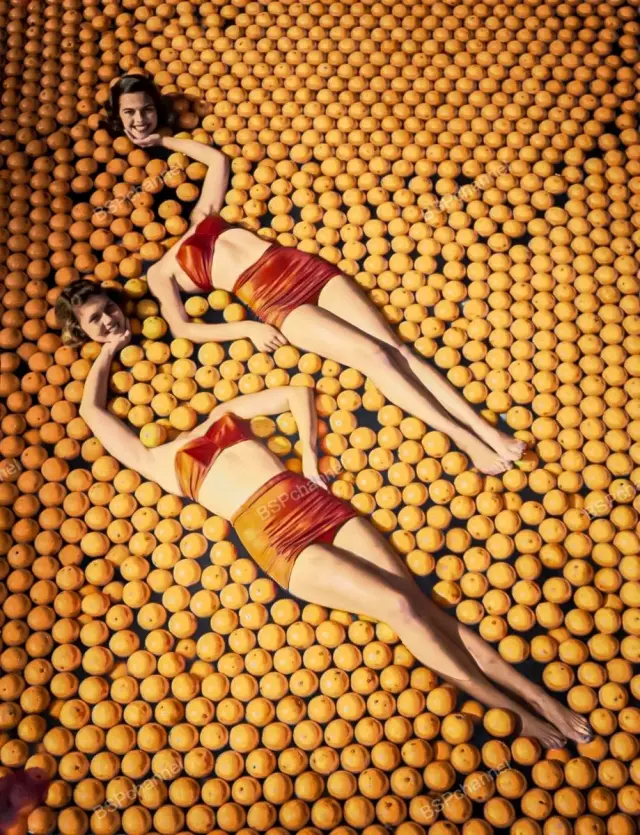 Семь женщин в купальниках. На Кони-Айленд состоялся конкурс красоты, в котором учитывалось только одно тело. Лица конкурсанток были скрыты масками. США, Кони-Айленд, 1935 год.