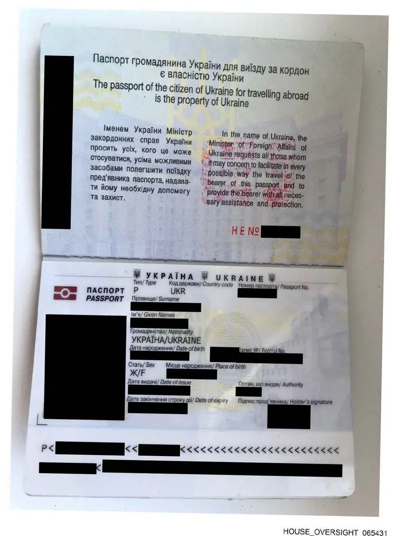 На снимках: украинский паспорт, Билл Гейтс, позирующий с женщиной, чье лицо было замазано, скриншот текстовых сообщений, в которых обсуждается отправка девушек, и фотография стопы с цитатой из романа «Лолита».