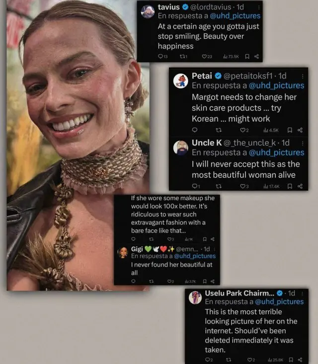 Марго Робби захейтили в соцсетях из-за фото без ретуши. Поклонница сделала селфи с актрисой — снимок быстро разлетелся по соцсетям и внезапно стал поводом для волны негатива. В комментариях начали писать, что Марго «сильно постарела», «плохо выглядит» и «это её худшее фото». Нашлись и особенно одарённые: один из пользователей заявил, что «в определённом возрасте нужно просто перестать улыбаться — красота важнее счастья». Также актрисе советовали срочно сменить уходовую косметику, удалить фото и уверяли, что «эту женщину точно нельзя назвать самой красивой».