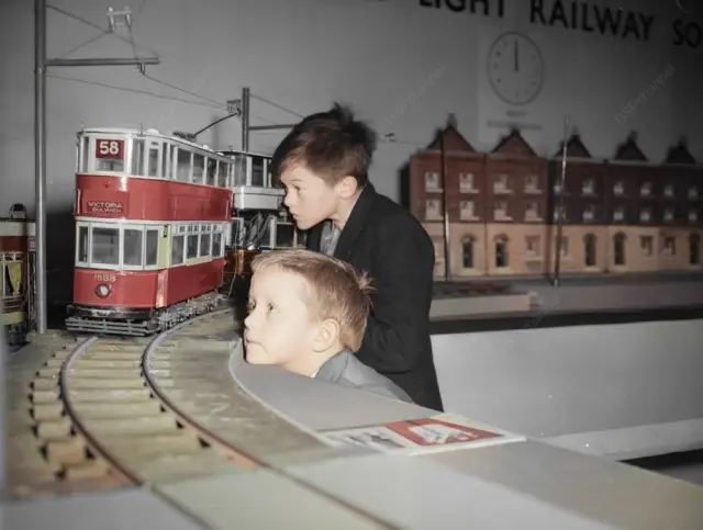 7. Ричард Ли и Раймонд Саттон наблюдают за миниатюрным трамваем, движущимся по рельсам на 5-й выставке моделей железных дорог в Центральном зале Вестминстера, Лондон, 1959 год.
