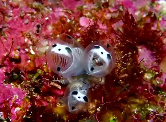 Скелетоподобное морское существо Clavelina ossipandae - прозрачный обитатель рифов с рёберными структурами и пятнами, напоминающими панду, создающими загадочный, словно оживший образ. Этот безвредный фильтратор воды встречается в Юго-Восточной Азии и играет важную роль в поддержании здоровья коралловых экосистем.