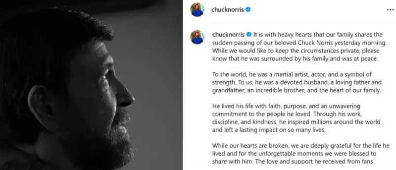 "С глубокой скорбью наша семья сообщает о внезапной кончине нашего любимого Чака Норриса вчера утром (19 марта - УНИАН). Хотя мы хотели бы сохранить обстоятельства в тайне, знайте, что он был окружен своей семьей и обрел покой", - говорится в заявлении семьи актера, оппубликованном на его странице в Instagram.