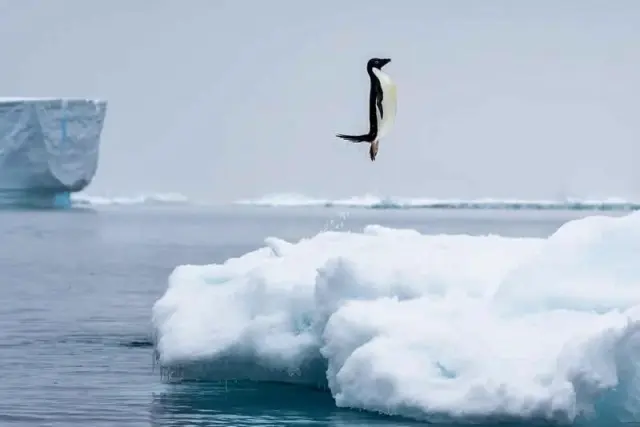 Пингвин идеально прямо выпрыгивает из холодных антарктических вод