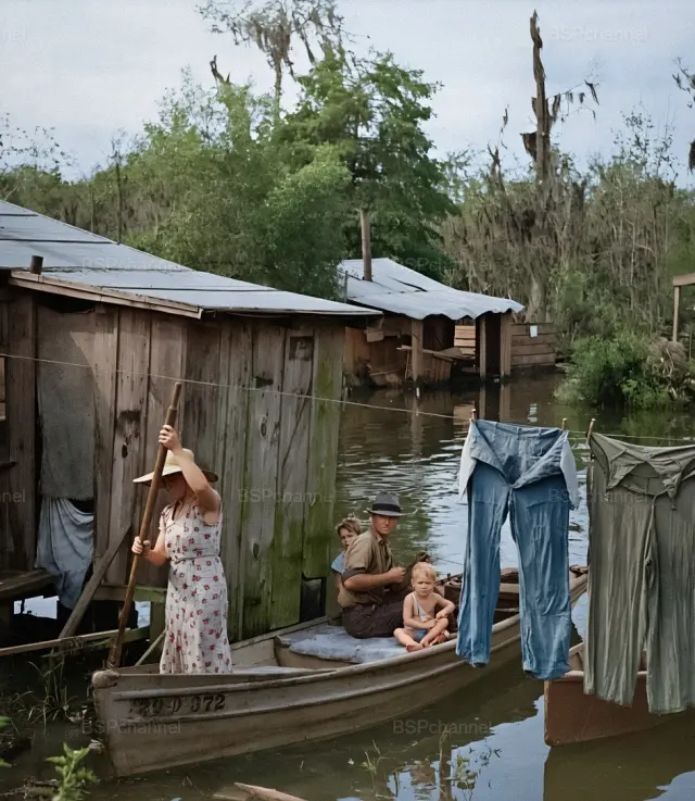 9. Семья рыбака возвращается с ранней утренней рыбалки недалеко от города Эйкерс, штат Луизиана, 1938 год.